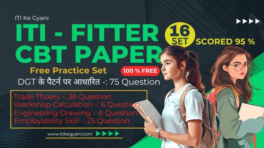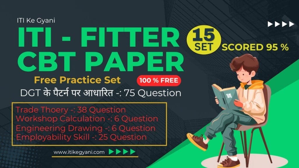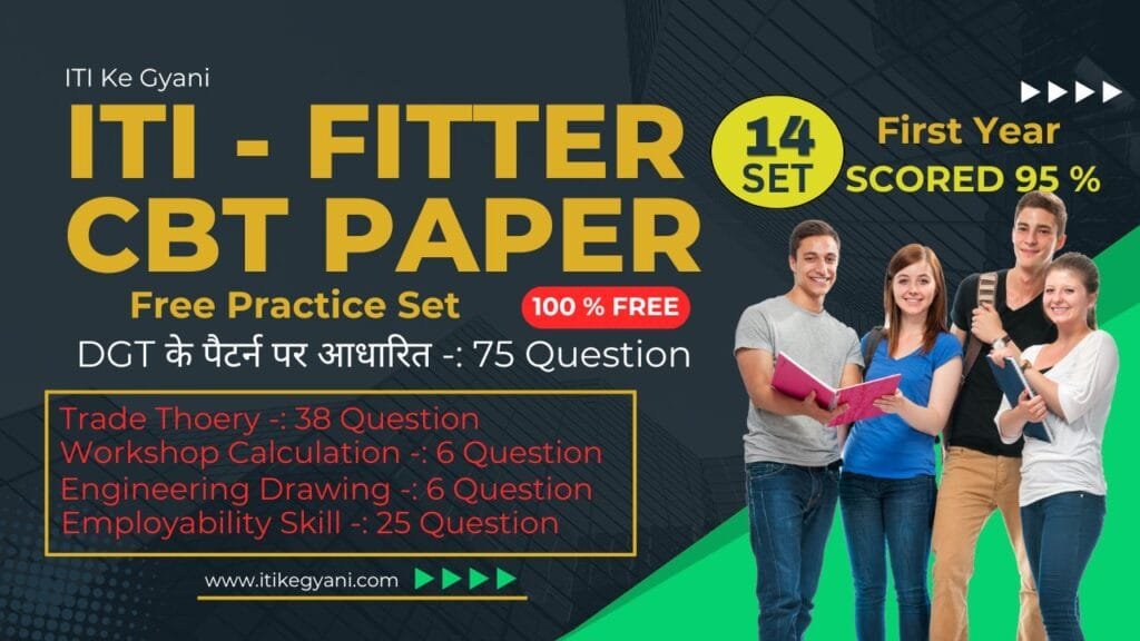 Fitter First CBT Paper as per DGT pattern इस पेपर में 75 प्रशन है जिसमे Trade Tehory के 38 प्रशन, Workshop Calculation and Science के 06 प्रशन, Engineering Drawing के 06 प्रशन, Employability Skill के 25 प्रशन , प्रत्येक प्रशन 2 मार्क्स का है और किसी प्रकार की नेगेटिव मार्किंग नहीं है|