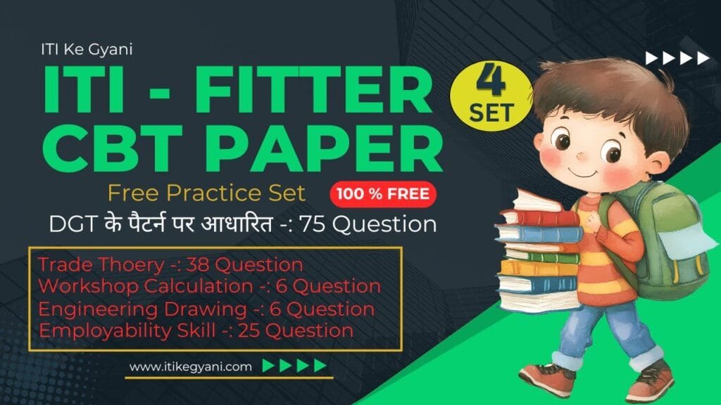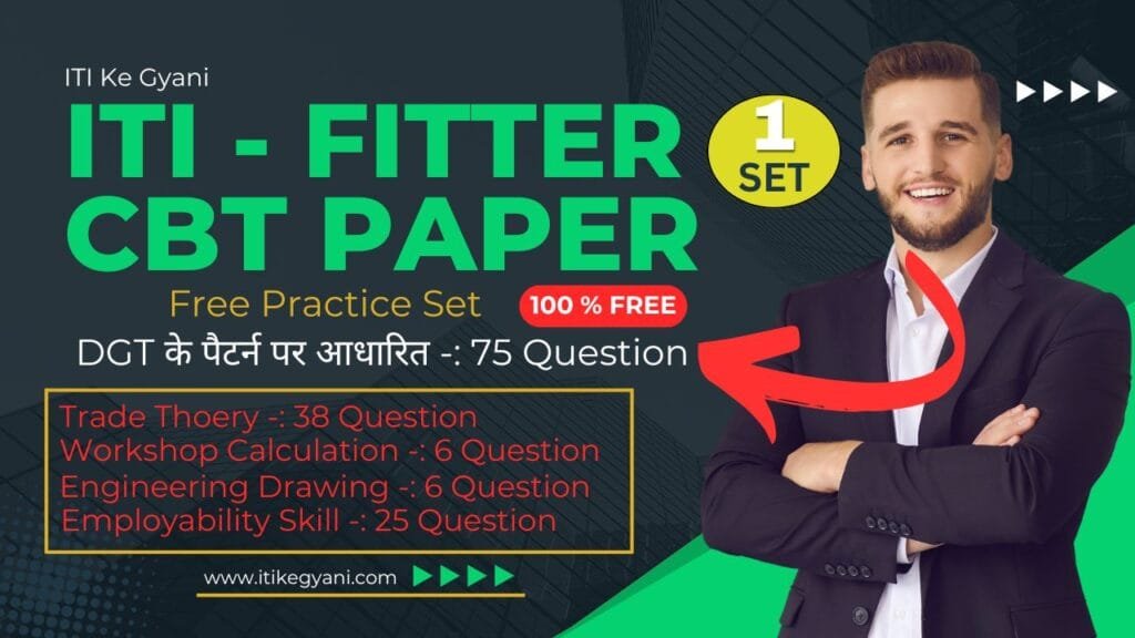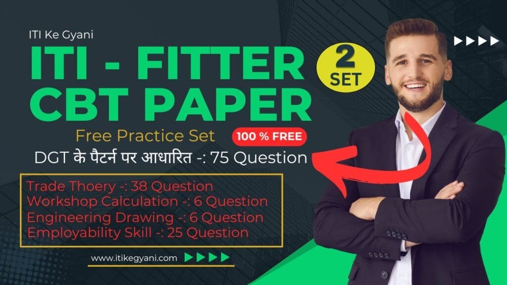 Fitter First CBT Paper as per DGT pattern इस पेपर में 75 प्रशन है जिसमे Trade Tehory के 38 प्रशन, Workshop Calculation and Science के 06 प्रशन, Engineering Drawing के 06 प्रशन, Employability Skill के 25 प्रशन , प्रत्येक प्रशन 2 मार्क्स का है और किसी प्रकार की नेगेटिव मार्किंग नहीं है|