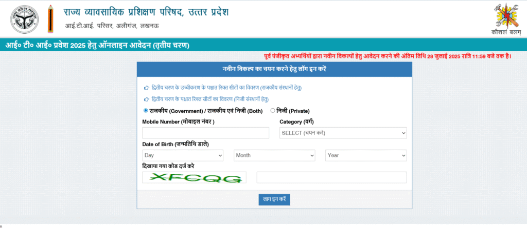 рдЙрддреНрддрд░ рдкреНрд░рджреЗрд╢ рдХреЗ рд╡реНрдпрд╛рд╡рд╕рд╛рдпрд┐рдХ рд╢рд┐рдХреНрд╖рд╛ рдПрд╡рдВ рдХреМрд╢рд▓ рд╡рд┐рдХрд╛рд╕ рд╡рд┐рднрд╛рдЧ рджреНрд╡рд╛рд░рд╛ рдПрдХ рдорд╣рддреНрд╡рдкреВрд░реНрдг рд╕реВрдЪрдирд╛ рдЬрд╛рд░реА рдХреА рдЧрдИ рд╣реИред рдЕрдЧрд╕реНрдд 2025 рд╕рддреНрд░ рдореЗрдВ рдкреНрд░рд╡реЗрд╢ рдХреЗ рдЗрдЪреНрдЫреБрдХ рдРрд╕реЗ рдЕрднреНрдпрд░реНрдереА рдЬрд┐рдиреНрд╣реЗрдВ рдкреНрд░рдердо рдПрд╡рдВ рджреНрд╡рд┐рддреАрдп рдЪрд░рдг рдореЗрдВ рдХрд┐рд╕реА рднреА рдЖрдИрдЯреАрдЖрдИ рдореЗрдВ рдкреНрд░рд╡реЗрд╢ рдкреНрд░рд╛рдкреНрдд рдирд╣реАрдВ рд╣реБрдЖ рд╣реИ рдпрд╛ рдЬреЛ рд░рд╛рдЬрдХреАрдп рдЖрдИрдЯреАрдЖрдИ рдХреА рд░рд┐рдХреНрдд рд╕реАрдЯреЛрдВ рдХреЗ рд▓рд┐рдП рдЖрд╡реЗрджрди рдХрд░рдирд╛ рдЪрд╛рд╣рддреЗ рд╣реИрдВ, рдЙрдирдХреЗ рд▓рд┐рдП рдпрд╣ рдПрдХ рдЕрдВрддрд┐рдо рдореМрдХрд╛ рджрд┐рдпрд╛ рд╣реИ рдЙрддреНрддрд░ рдкреНрд░рджреЗрд╢ рд╕рд░рдХрд╛рд░ рджреНрд╡рд╛рд░рд╛ рддрд╛рдХрд┐ рддреАрд╕рд░реЗ рдЪрд░рдг рдореЗрдВ рдЖрдкрдХрд╛ рд░рд╛рдЬрдХреАрдп рдЖрдИрдЯреАрдЖрдИ рдкреНрд░рд╡реЗрд╢ 100% рд╣реЛред